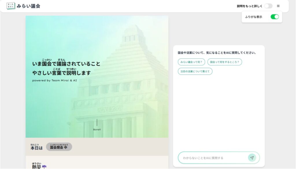 一般財団法人ルビ財団(所在地:東京都港区、代表理事:伊藤 豊、以下ルビ財団)は、自動ふりがな表示機能「ルビフルボタン」が、チームみらいにより制作された国会でいまどんな法案が検討されているか、わかりやすく伝えるプラットフォーム「みらい議会」に導入されたことをお知らせします。